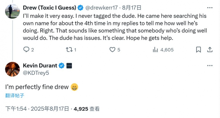 PG模拟器-网友疑惑未互动却频获KD回复 KD幽默回应状态良好无需担忧